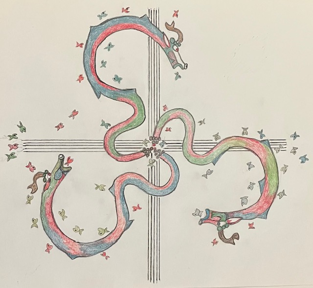 January 2, 2023A Christmas Sea Serpent and a prayer for the new year? Yes this drawing in pencil is what I call Bear Scratchings (The cross is made from five claw scratchings, which bears do quite often). The serpent theme or symbol of the Christ manifest is a nod to such symbolism found in the Book of Kells a 5th century illuminated Gospels from Ireland. The serpent symbol may go back to John 3: 14-15. Jesus is quoted as saying he will be lifted up as the serpent was lifted up by Moses. The three circling serpents are also a nod to the Greek Caduceus, which shows entwined snakes as a symbol of healing. It is also a nod to the Ouroborus a symbol of wholeness as the sea serpents are eating the small fish as the small fish are eating the sea serpents. All of which are held to gather by the Bear Scratching cross. The Blue-eyed Bear definitely prays for wholeness and healing as we move into the coming year.