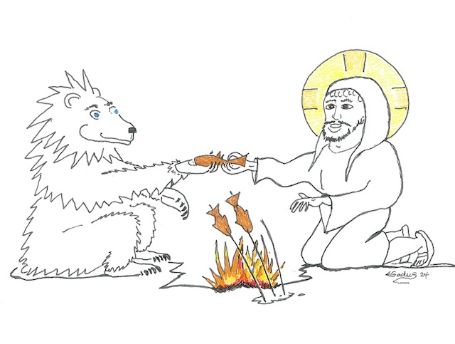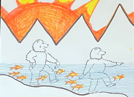 The Blue-eyed Bear encounters the Burning Bush aka YHWH as part of her canvassing all the many aspects of God for help with finding a safe home for herself and all creatures great and small in this time of Climate Crisis. The Bear acknowledges the promise of YHWH’s covenant with all Creatures in which YHWH loves and takes great delight (Job chap.38-39). The Bear prays: “Please give humans the capacity to see all creatures through the eyes of God so that each may find their true place as part of the