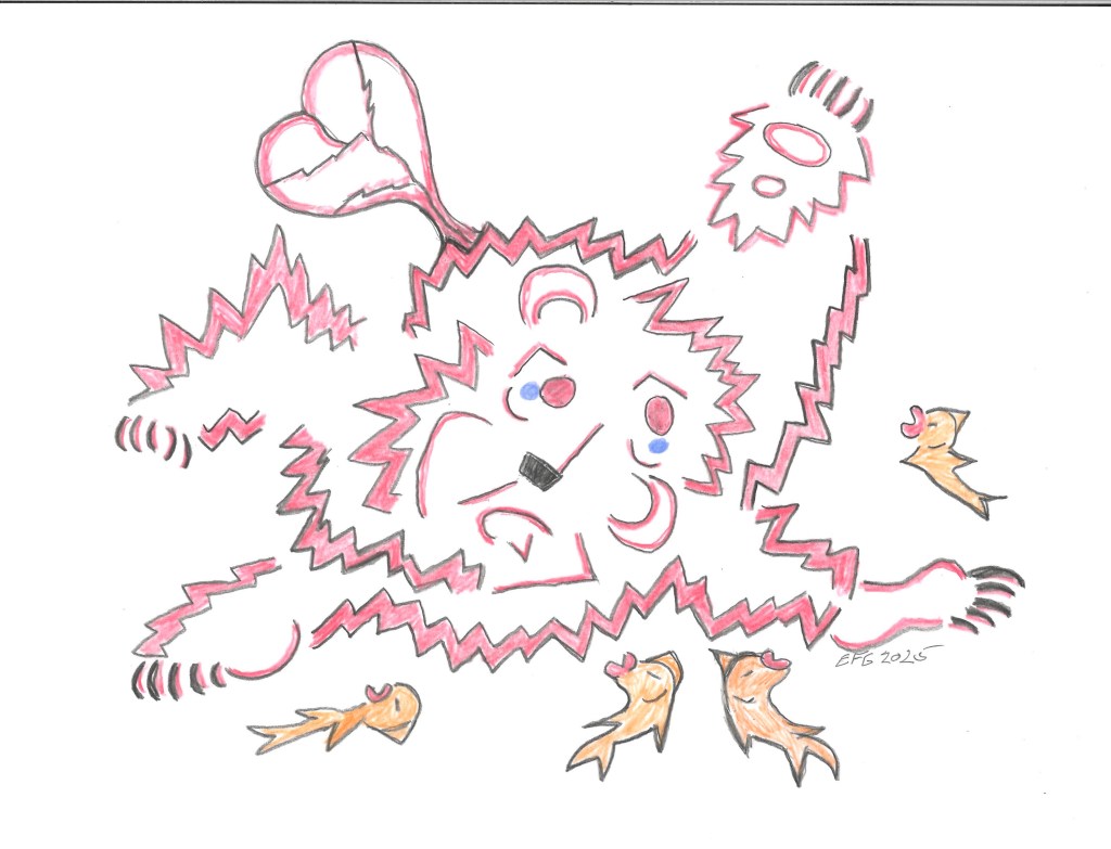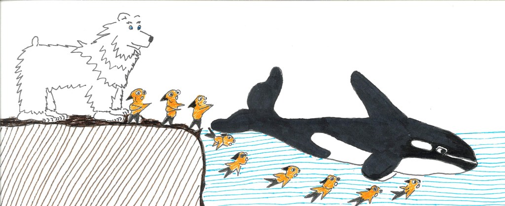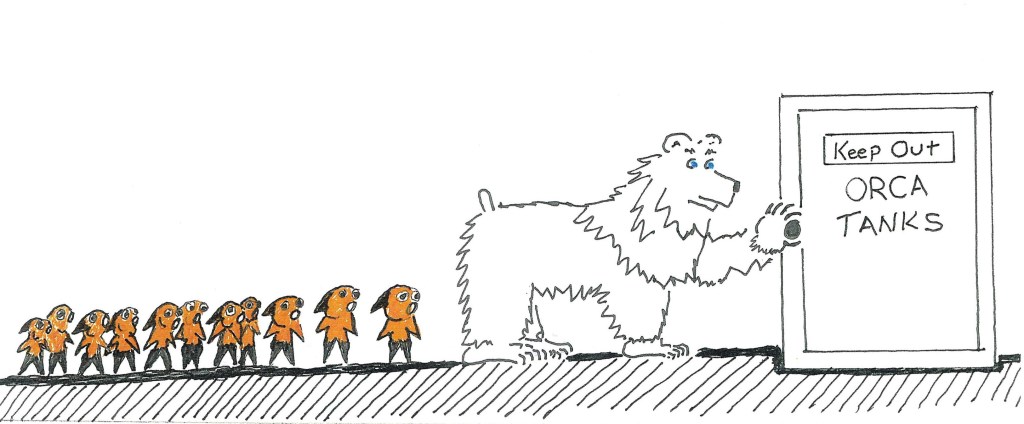 The BE Bear drawing above is the Bear’s imagining of Sid’s release back to his fishy family. Unlike Guard Dog whom Patrick remained Sparky and gave him a fine home, Patrick doesn’t share what happened to Sid after his dramatic release by a superhero Namor in the strip on July 19 2023. Still, Sid’s release is a great example of “emptying the tanks” for all creatures such as dolphins and orcas that belong in the wide ocean not small bowls or tanks. The BE Bear says let us work toward this release in 2024 using this little fish in a comic strip as our example. Yes, maybe it will take a superhero to gain their release.