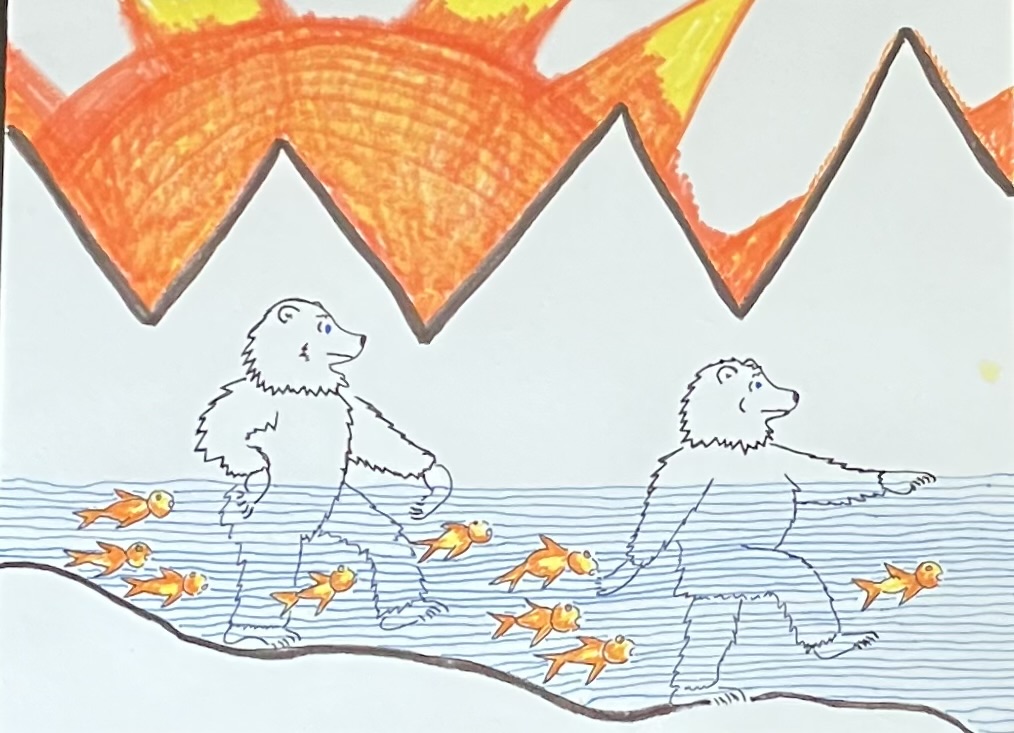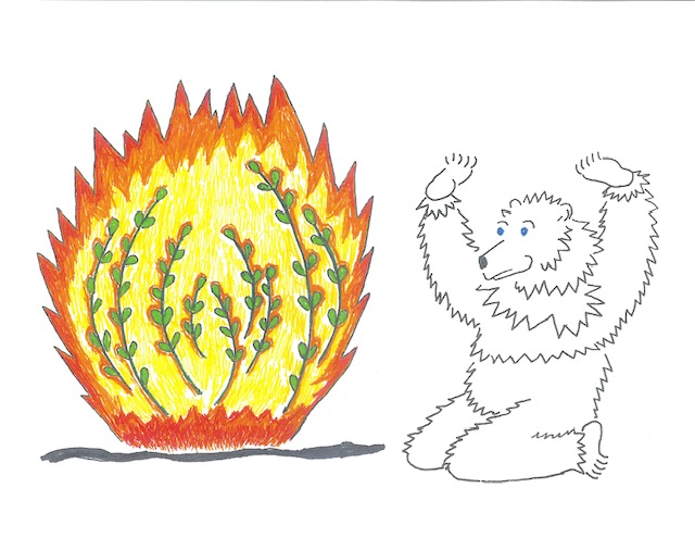 The Blue-eyed Bear encounters the Burning Bush aka YHWH as part of her canvassing all the many aspects of God for help with finding a safe home for herself and all creatures great and small in this time of Climate Crisis. The Bear acknowledges the promise of YHWH’s covenant with all Creatures in which YHWH loves and takes great delight (Job chap.38-39). The Bear prays: “Please give humans the capacity to see all creatures through the eyes of God so that each may find their true place as part of the