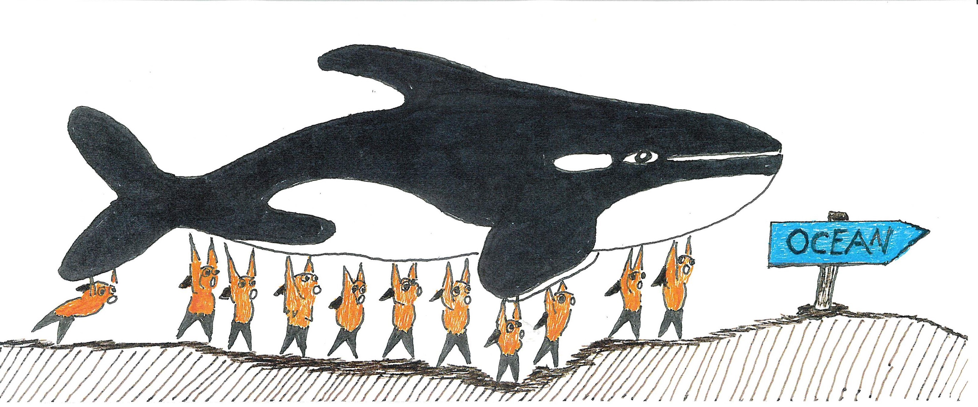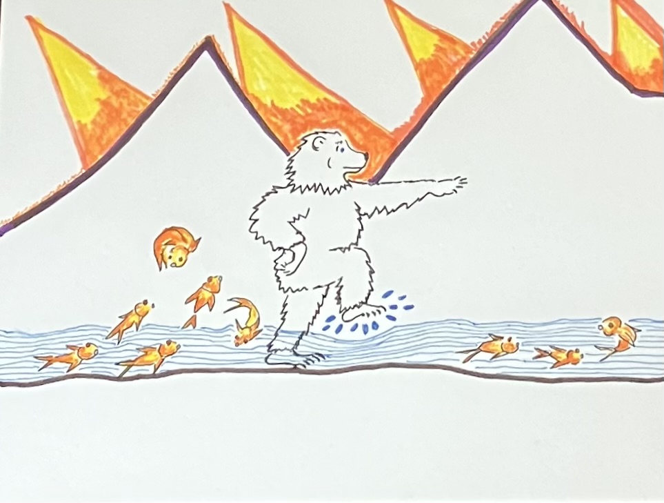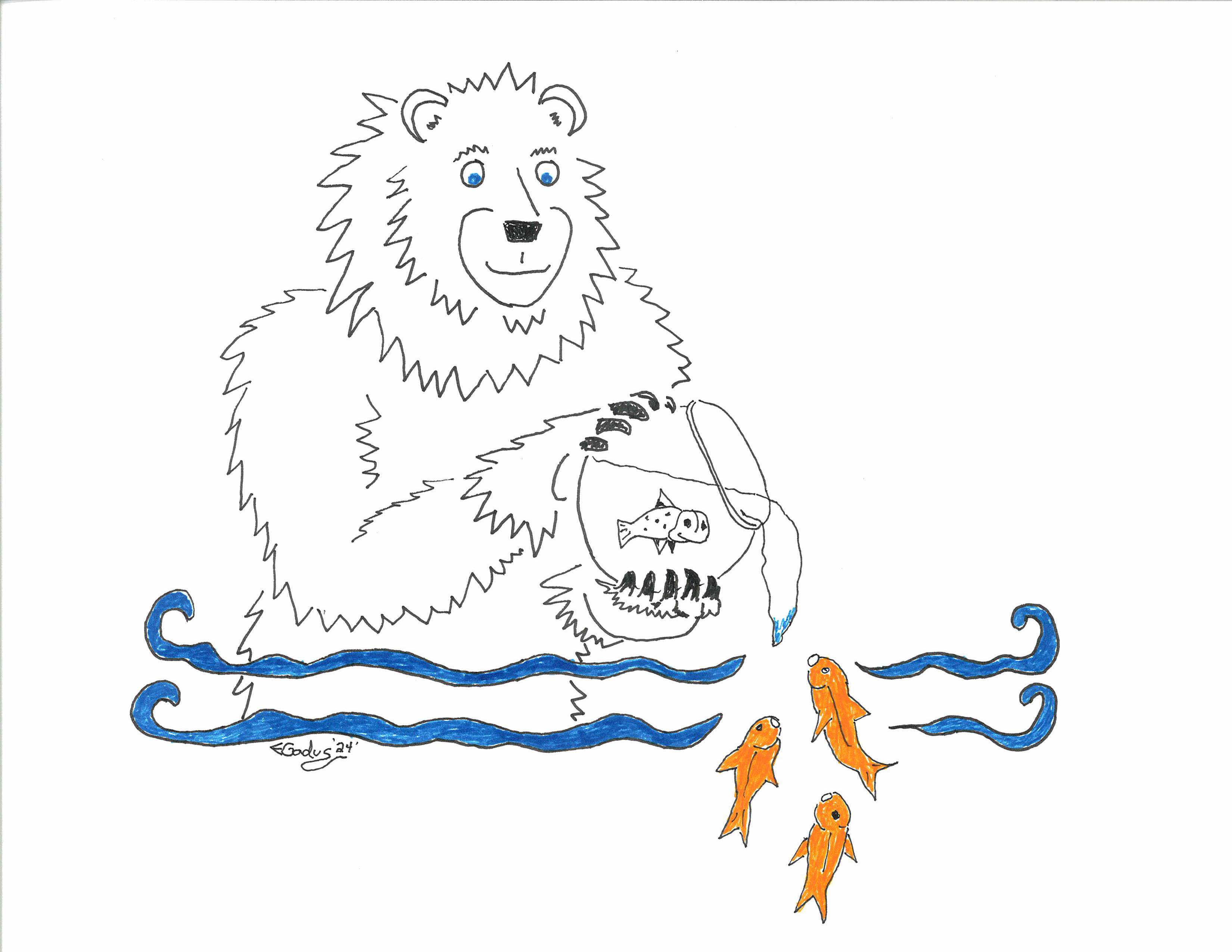 The BE Bear drawing above is the Bear’s imagining of Sid’s release back to his fishy family. Unlike Guard Dog whom Patrick remained Sparky and gave him a fine home, Patrick doesn’t share what happened to Sid after his dramatic release by a superhero Namor in the strip on July 19 2023. Still, Sid’s release is a great example of “emptying the tanks” for all creatures such as dolphins and orcas that belong in the wide ocean not small bowls or tanks. The BE Bear says let us work toward this release in 2024 using this little fish in a comic strip as our example. Yes, maybe it will take a superhero to gain their release.