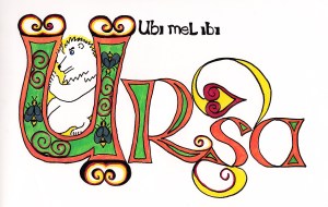 The Blue-eyed Bear is exploring the wildness within the Book of Kells a 9th century Irish/Celtic illuminated Gospel. There is a whole bestiary within the pages of the book, but no bears. So the B-E Bear created her own illuminated passage. It states “where there is honey there are bears.”