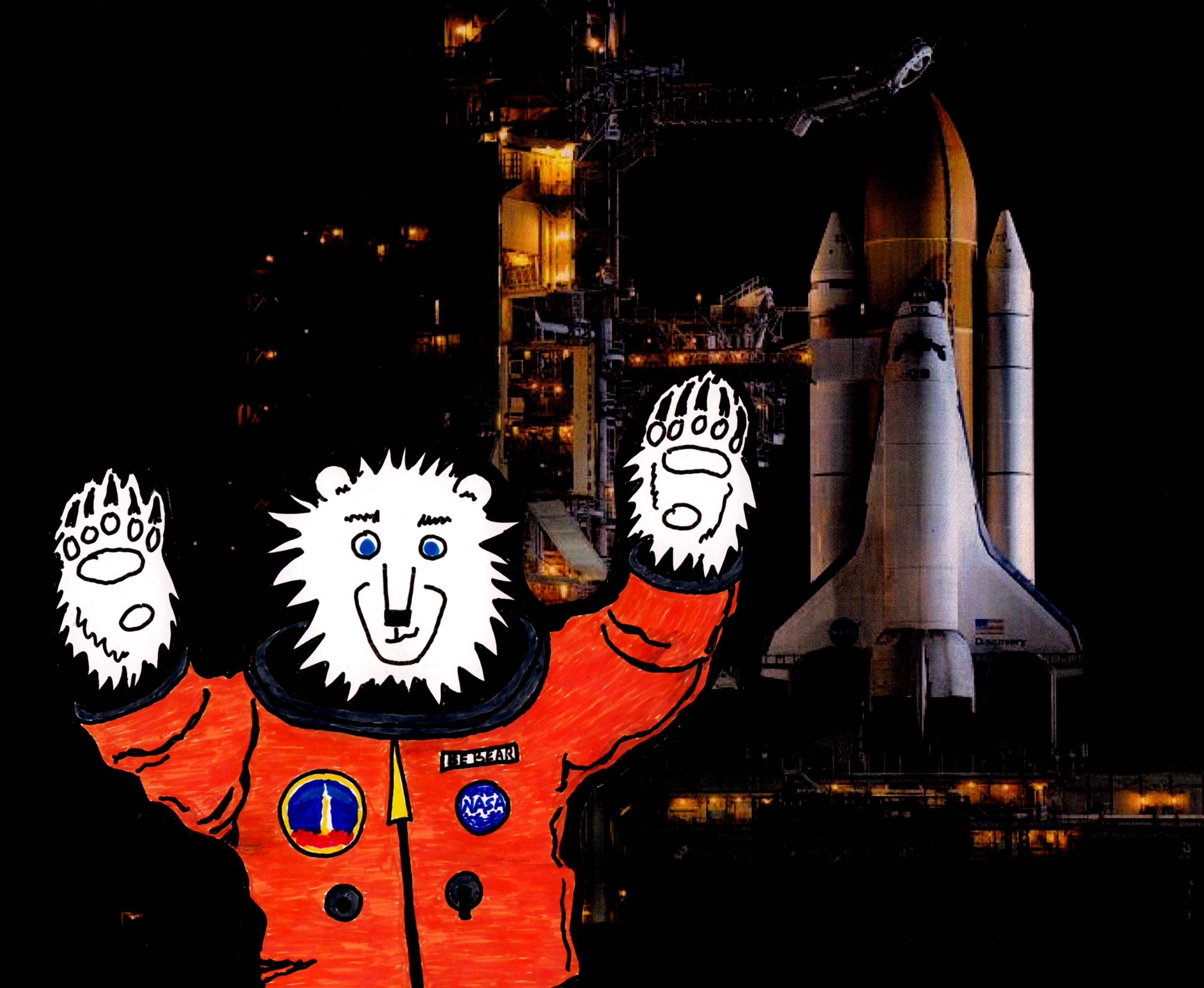 The Blue-eyed bear is aboard the Space Shuttle Discovery as part of NASA’s “Faces in Space” program. When the rest of the crew was busy she got a chance to look out Discovery’s front windows for a peak at home. The BE Bear has never seen anything so beautiful and is extremely home-sick! But, it will only be a 12 day mission and there is sure to be some interesting adventures ahead.