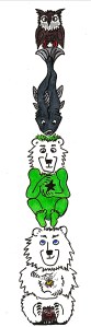 It just happened that night was falling and the first Bears spotted Little Owl. Little Owl had keen sight an great hearing so that she could hunt on land in the dark of night. The first Bears ask the Little Owl to give the gift of good sight and hearing to the green creatures from the Sea so that they too could hunt on land and make a living. But Little owl had a price. You see she had no voice. So for the gift of good sight and hearing she was given the plaintive cries of the green creature from the Sea. And to this day you can still hear Little Screech Owl’s own plaintive cry.