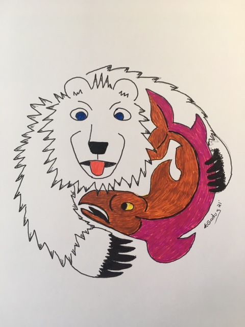 What is the meaning of the protruding tongue? It is common in the Native Tlingit style of bear imagery. Below is the blue-eyed bear version of the Native bear as portrayed by Alaskan artist Julie Thompson.