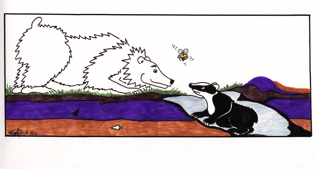 December 5, 2021The Blue-eyed Bear had a recent encounter with Badger; no worries they’er friends. Bear found that Badger, or Brock as the Celtic people called her, can be a determined traveler and has great love for her family. Bear wishes Brock peace and a safe return to her home burrow soon. See archive Oct 2010 for initial meeting.